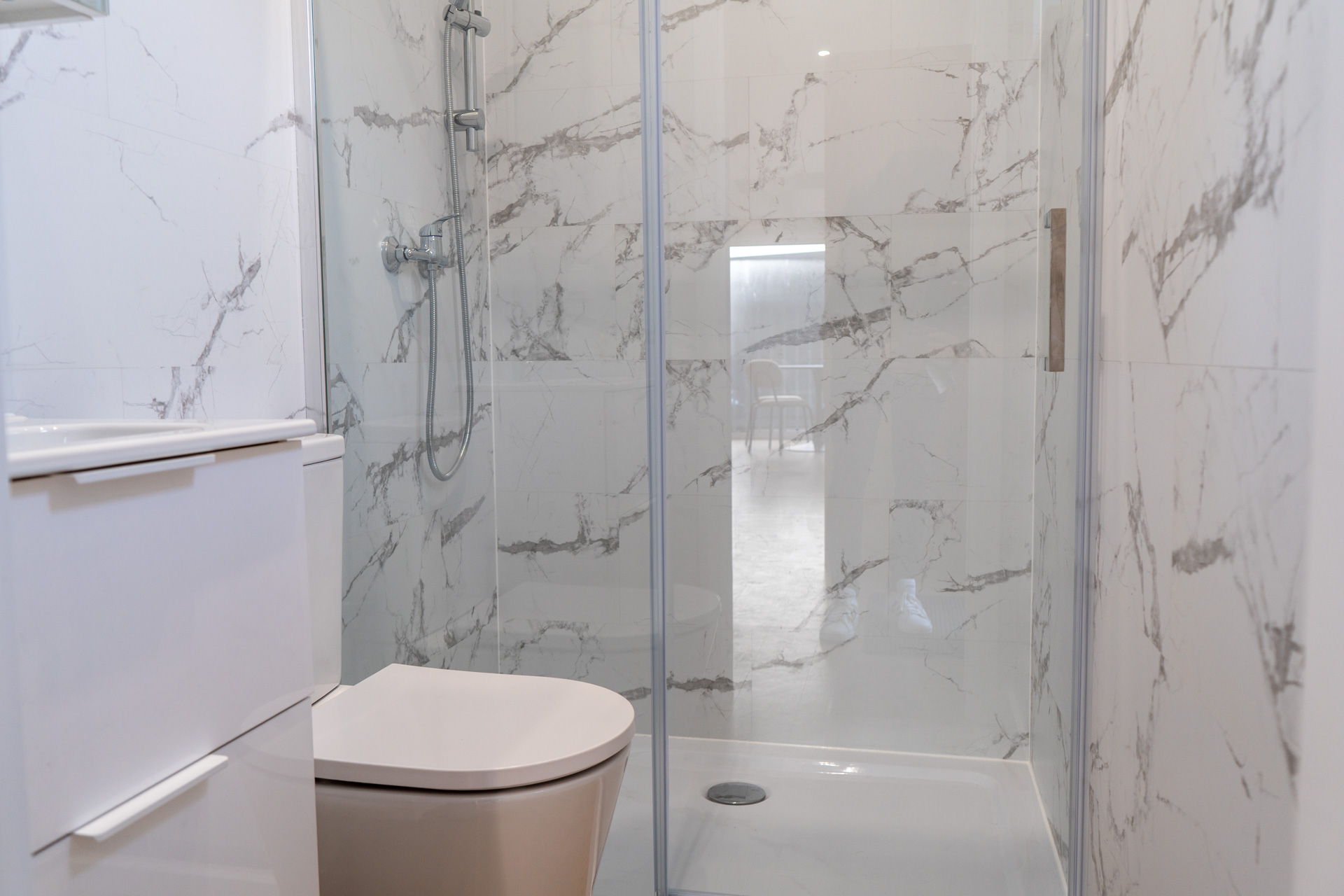 De standaard sanitaire voorzieningen omvatten onder andere een Cersanit Sat 50 wastafel met Fabro chrome kraan, een Mexen Roma douchebak met Fabro chrome kraan, en een wandcloset met inbouwreservoir. Let op dat de exacte voorzieningen kunnen variëren afhankelijk van beschikbaarheid en vernieuwing van het assortiment.